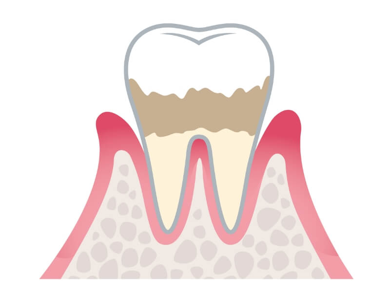 歯周病はむし歯と同じように自然には治らず、症状を放置していると進行していきます。歯周病菌が出す毒素による影響は、歯肉の炎症だけではありません。歯のセメント質や歯根膜、歯を支える役割を持つ歯槽骨などの歯周組織が破壊され、最終的に歯が抜け落ちてしまうのです。